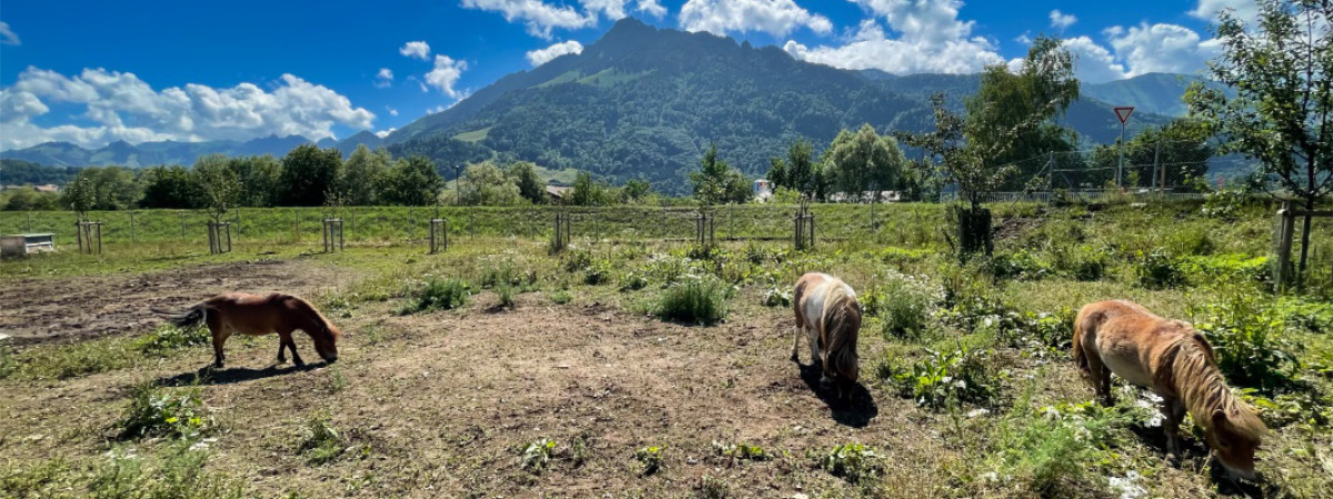 Colibri, Dona & Brunette sont nos trois poneys. Ils sont profitables pour conserver notre exploitation propre et font le plaisir des petits et des grands.